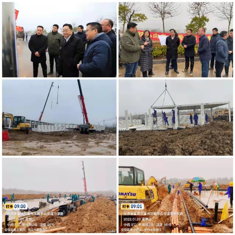 截止1月26日,現(xiàn)場(chǎng)已完成10000平方米混凝土硬化,雨污水管道、室外水電管道安裝進(jìn)展迅速,集裝箱板房開始拼裝。天氣惡劣、工期緊迫,一線人員努力克服各種困難和障礙,迎難而上。1月25日下午,區(qū)政府召開宣州區(qū)新冠肺炎疫情防控工作專題會(huì)議,審定了隔離點(diǎn)項(xiàng)目方案,明確了相關(guān)事項(xiàng),會(huì)議對(duì)施工進(jìn)度和現(xiàn)場(chǎng)管理給予了充分的肯定,同時(shí)也要求在嚴(yán)把工程質(zhì)量關(guān)和隔離點(diǎn)各項(xiàng)要求的基礎(chǔ)上,倒排工期,加快施工,確保早日交付使用。