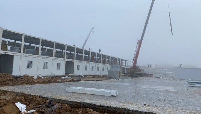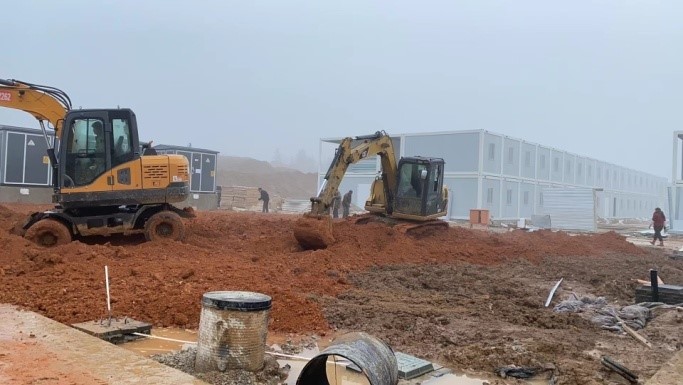 2月14日,宣州區(qū)疫情防控臨時隔離點項目現(xiàn)場機器聲轟鳴、腳步聲交響,新一天的施工作業(yè)從漫天大霧的清晨里井而有序的展開。