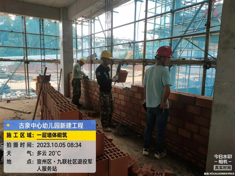 在宣州區(qū)古泉中心幼兒園項目,為了保障明年秋季招生,施工隊伍正在對一層墻體進行砌筑。