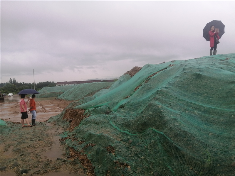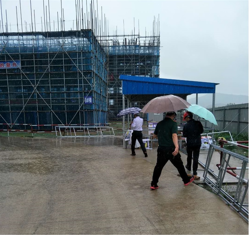 工作人員冒雨帶領(lǐng)客戶查看砂石資源處置現(xiàn)場