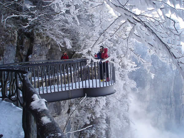 據(jù)施工人員介紹,此條棧道也是他們所修棧道中施工最難,最險(xiǎn)峻的一條。如果您還覺得不夠刺激的話,在棧道的完結(jié)處的兩個(gè)懸崖之間有一條長(zhǎng)160米的懸索吊橋,同時(shí),在海拔最高點(diǎn)還有一個(gè)挑戰(zhàn)心里極限的玻璃站臺(tái),在這里,如果你能挺直腰板伸開雙臂,那么,您就是真正的勇士了。