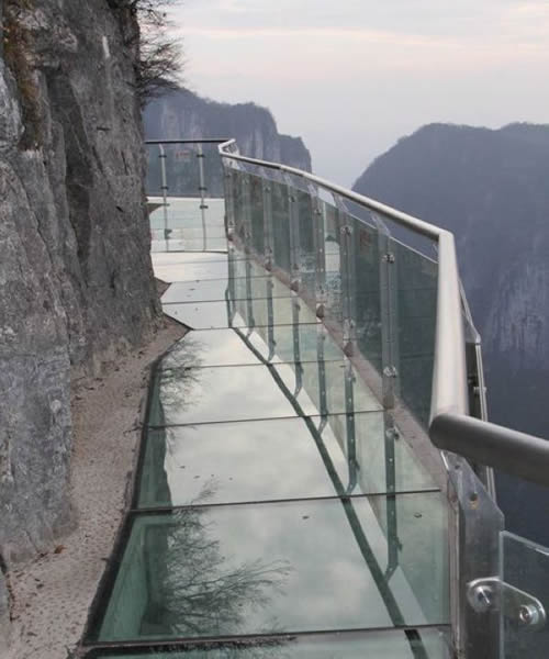 2011年10月1日,張家界天門山國家森林公園新建的玻璃棧道正式對(duì)游客開放。玻璃棧道懸于天門山頂西線,長(zhǎng)60米,最高處海拔1430米。是張家界天門山景區(qū)繼懸于峭壁之上的鬼谷棧道、憑空伸出的玻璃眺望臺(tái)、從玻璃臺(tái)可以看見下面。玻璃臺(tái)伸出棧道有4-5米,專供游人拍照、橫跨峽谷的木質(zhì)吊橋后打造的又一試膽力作。為了讓游客零瑕疵的透過玻璃橋看到美麗的風(fēng)景,上橋的游客均要求戴上鞋套,以保持玻璃橋的透明和干凈。玻璃棧道的刺激震撼,可與舉世聞名的美國大峽谷玻璃走廊“天空之路”媲美,因而有了東方“天空之路”的美譽(yù)。