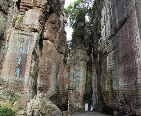清嘉慶年間辟有洗心池!安欢T”如斧斫神劈,為石林天成,石林壁上鐫滿歷代文人的詩詠。這里古柏參天,藤蘿倒掛,環(huán)境幽美。有壁石如書的萬卷書者,有嵐霧束腰的七級青石培英塔。凝神盤坐的南海觀音是一塊天然造型的巨石,惟妙惟肖。觀音巖周圍,環(huán)繞著具有明清風(fēng)格的地藏庵、嵩山堂、水府閣等建筑物,布局靈巧緊湊,主題鮮明,因勢造景。景點(diǎn)間曲徑迂回,迷趣深奧,稱八陣圖。景區(qū)內(nèi)的河灘上有兩處溫泉,氤氳縈繞,水溫適宜(41℃),水質(zhì)良好,能治療多種疾病。縣城人民經(jīng)“不二門”前往溫泉就浴者絡(luò)繹不絕,現(xiàn)又增建了石牌坊和民俗博物館。