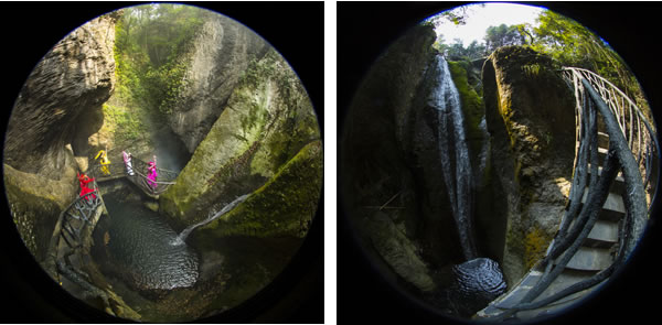 走在吊橋中間,必須保持自身的平衡方能安全通過(guò),不然就會(huì)在吊橋上搖擺不定。走出仙女峽谷,往下看,深不見(jiàn)底,七潭七瀑在奇險(xiǎn)之中不乏壯觀,這里曾發(fā)生過(guò)跳潭救女的故事。