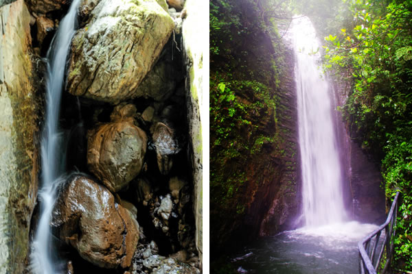 西線原名叫雪花溪,又叫雪花洞,水從懸崖上掉下來(lái)濺起水花,泉水與巖石相碰,落成大霧,形成雪花狀,故名雪花溪。因地勢(shì)險(xiǎn)峻,歷代人都沒(méi)有把雪花溪走通過(guò),從下往上看深不見(jiàn)底,古人以為是一個(gè)洞,故又叫雪花洞,其實(shí)是一個(gè)峽谷,有七潭七瀑,現(xiàn)在叫“仙女峽谷”。峽谷長(zhǎng)800米,最窄處僅1米左右,上下落差近200米,因水的長(zhǎng)期回旋沖刷, 巖層的堅(jiān)硬度各異,形成了底寬頂窄,時(shí)北,時(shí)西,時(shí)東,陰暗無(wú)光,形似溶洞, 泉水飛流直下,形成梯級(jí)瀑布,擊打在巖壁上濺起的水花猶如雪花飛舞,潭中一片雪白,古人稱之為雪花洞,峽谷中有七個(gè)各異的潭池在沖擊的水花中若隱若現(xiàn),故改稱為七仙女人間沐浴瑤池,從開(kāi)天辟地起無(wú)人行通過(guò),現(xiàn)在已修好的占道,于峽谷水花之中,幻入仙境之感。