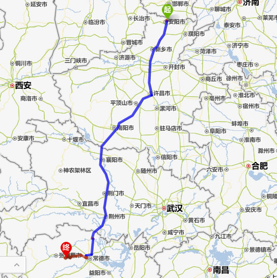 左右,沿途經過安陽——新鄉(xiāng)——許昌——南陽——襄陽——荊門——荊州——常德(也可以走國道經澧縣、石門縣)——慈利——張家界。