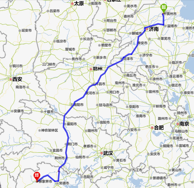 左右,沿途經過濱州——淄博——濟南——平陰縣——菏澤市——蘭考縣——許昌市——平頂山——南陽——襄陽——荊門——荊州——常德(也可以走國道經澧縣、石門縣)——慈利——張家界。